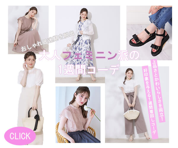 大人フェミニンのコーディネート案 ワンピースやブラウスにバッグやシューズの画像も配置。雑誌の1ページ風になるよう工夫しました。