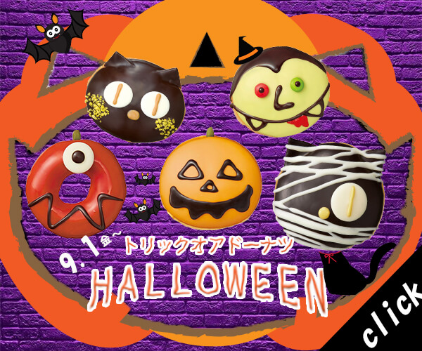 ハロウィンのイメージカラーを意識して パンプキンのイラストを作成し、その上に かわいく楽しそうな雰囲気が伝わるように ドーナツを配置しました。 -